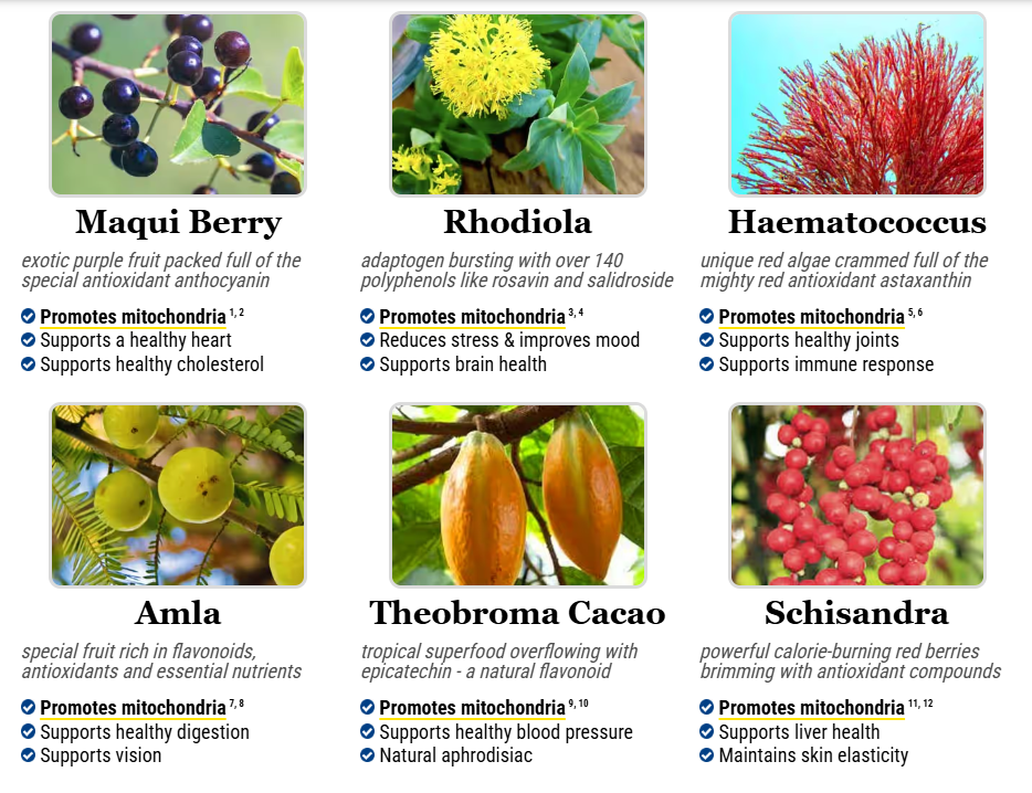 1. Maqui Berry – A purple fruit rich in anthocyanins, antioxidants that protect cells and enhance mitochondrial biogenesis. It also supports heart health and helps reduce cholesterol.